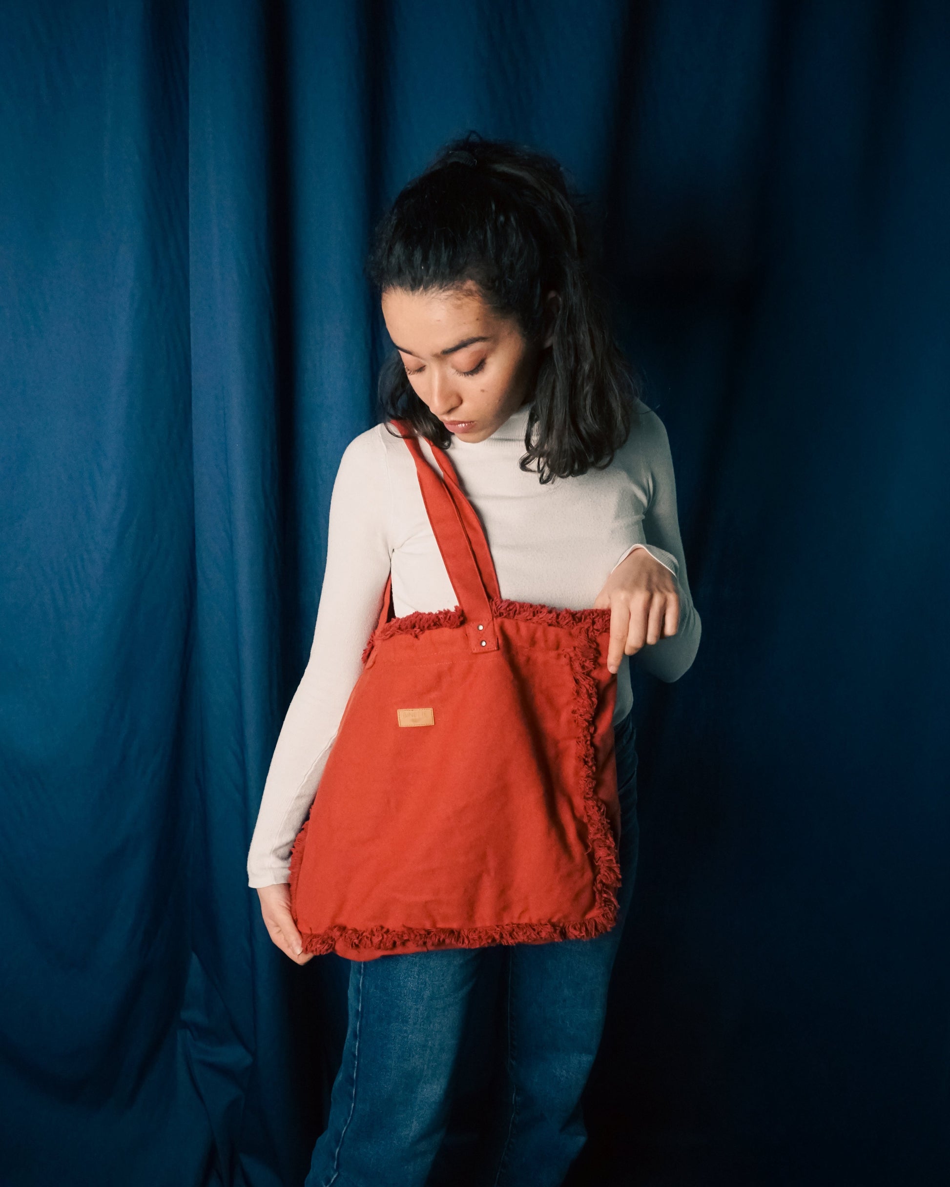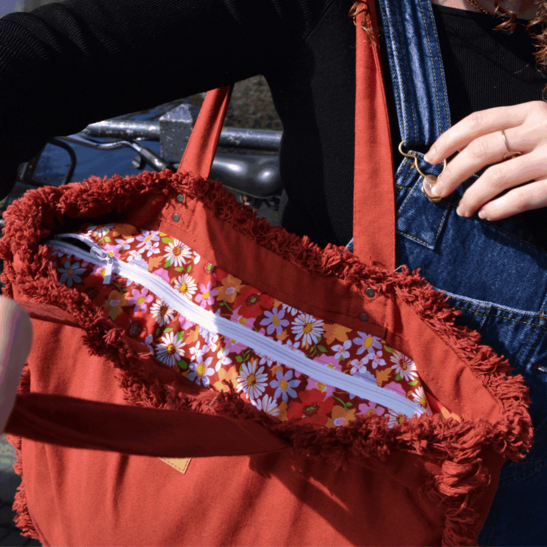 La couleur du sac cabas Rouge Terracotta n'a pas eu de modification ! Récupéré tel quel, nous l'avons uniquement upcyclé avec de la confection de doublure et de zip.